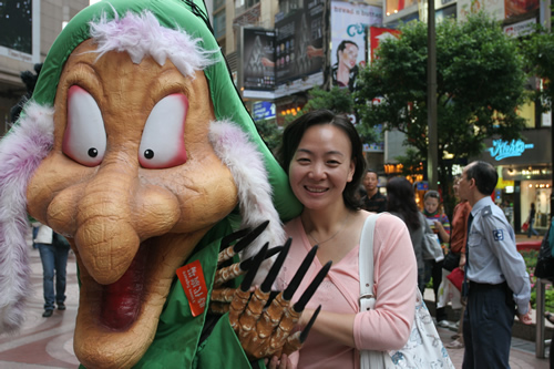 我們記者團(tuán)抵港的次日,即為西方著名的萬(wàn)圣節(jié)。時(shí)代廣場(chǎng)、銅鑼灣、蘭桂坊等西方人聚集地,鬼影憧憧,各種奇形怪狀的鬼魅競(jìng)相走上街頭,游人爭(zhēng)相與之合影,小店酒吧亦裝飾相襯托的背影燈光,增添神秘色彩,組成一道道內(nèi)地少見的獨(dú)特風(fēng)景。