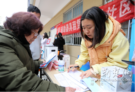 在武漢關東街道江南社區(qū)一困難老人家中,老人正高興地聆聽康復輔助器具惠民租賃政策。