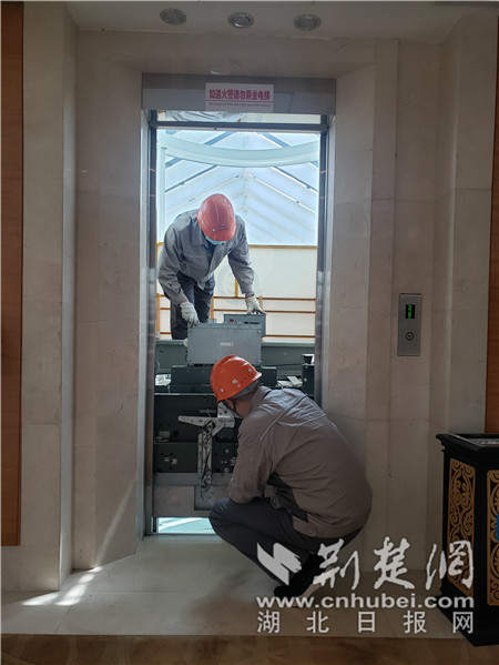 檢驗員對東湖賓館的電梯進行細致檢驗。