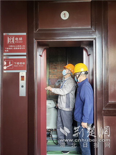 檢驗員對黃鶴樓景區(qū)內的電梯進行檢驗