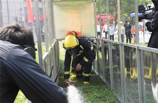 應(yīng)急技能大比武結(jié)束后,現(xiàn)場(chǎng)還進(jìn)行了綜合應(yīng)急演練。情景設(shè)置某庫(kù)房發(fā)生火災(zāi),有人員被困,相關(guān)部門和單位接警后迅速到達(dá)現(xiàn)場(chǎng),破拆廠房大門后打通救援通道進(jìn)入火場(chǎng),將大火撲滅。