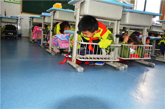 當天上午9:30,隨著指揮長一聲令下,防空警報聲響徹校園,只見學生們在教室迅速蜷曲身體,蹲伏在桌下,利用課桌有效進行自護,等待逃生信號。