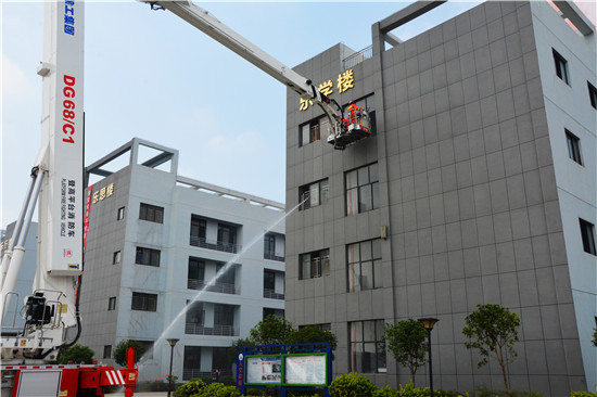 消防救援組指揮員臨時決定采用2臺舉高噴射消防車在教學樓外側(cè)內(nèi)攻滅火,在樓道處利用68米登高平臺消防車實施人員轉(zhuǎn)移。隨著登高平臺緩緩將至地面,被困4名師生成功獲救。