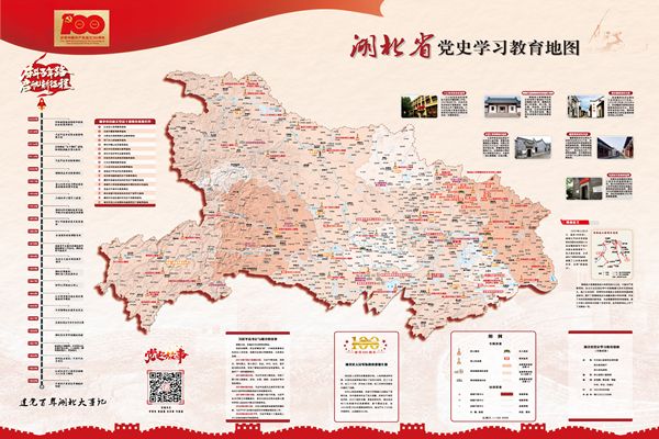 《湖北省黨史學習教育地圖》以湖北省普通地圖為底板,嵌入人物、事件和紅色資源等要素,圖文并茂,直觀呈現(xiàn)重要黨史事件和重要紅色遺跡,包含有教育地圖、建黨百年湖北大事記、省直機關黨員干部教育基地名單、習近平總書記與湖北故事、湖北籍開國將帥名錄、黨史故事二維碼等模塊內容。其中教育地圖重點標繪了省內烈士陵園、紀念碑、革命根據(jù)地紀念館、舊址、名人故居等重要學習教育基地,全方位、多角度地展現(xiàn)了湖北這片熱土上發(fā)生的重要歷史事件。