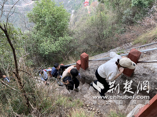 徒步攀登陡峭的石階到山頂核查數(shù)據(jù)。通訊員供圖
