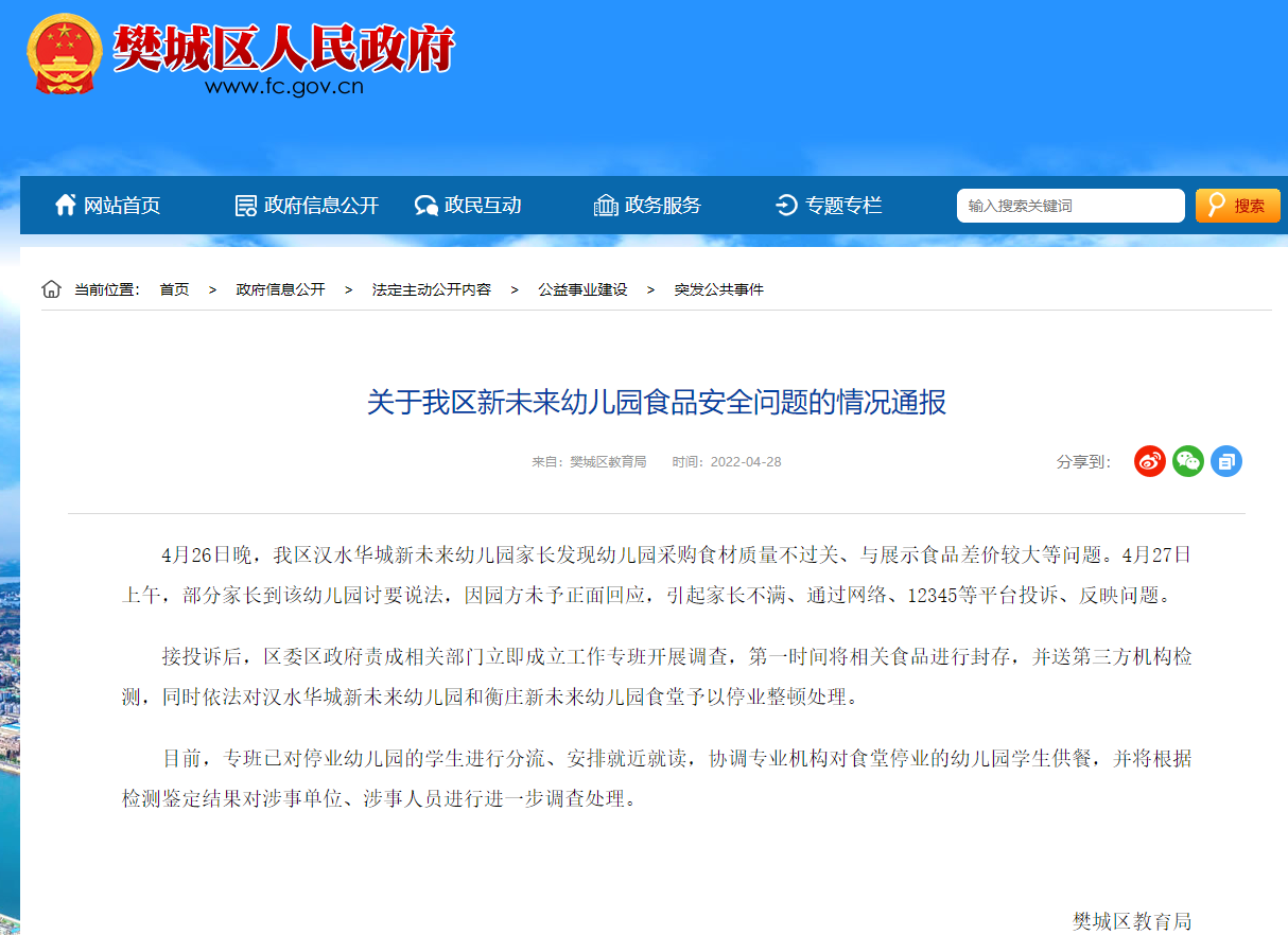 接投訴后,區(qū)委區(qū)政府責(zé)成相關(guān)部門立即成立工作專班開展調(diào)查,第一時間將相關(guān)食品進(jìn)行封存,并送第三方機(jī)構(gòu)檢測,同時依法對漢水華城新未來幼兒園和衡莊新未來幼兒園食堂予以停業(yè)整頓處理。