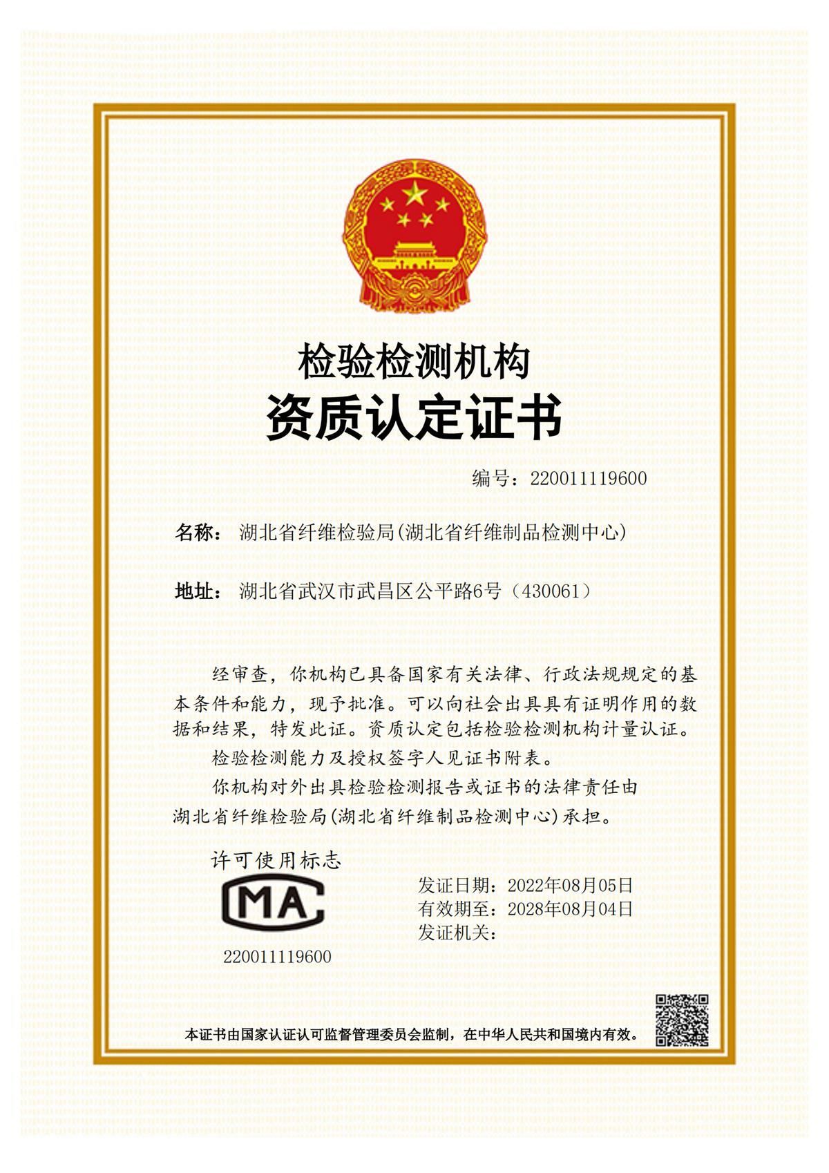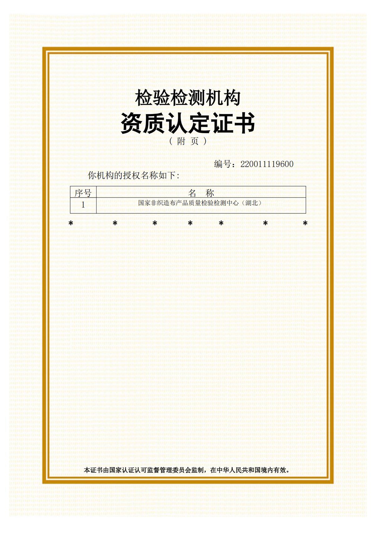 國(guó)家非織造布產(chǎn)品質(zhì)量檢驗(yàn)檢測(cè)中心(湖北)(籌)獲得國(guó)家級(jí)資質(zhì)認(rèn)定證書(shū)