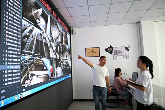 在麥市鎮云岳智農(湖北)農業開發股份有限公司5G監控平臺前,技術員黎丹邊操作平臺,邊觀看農戶飼養的生豬。