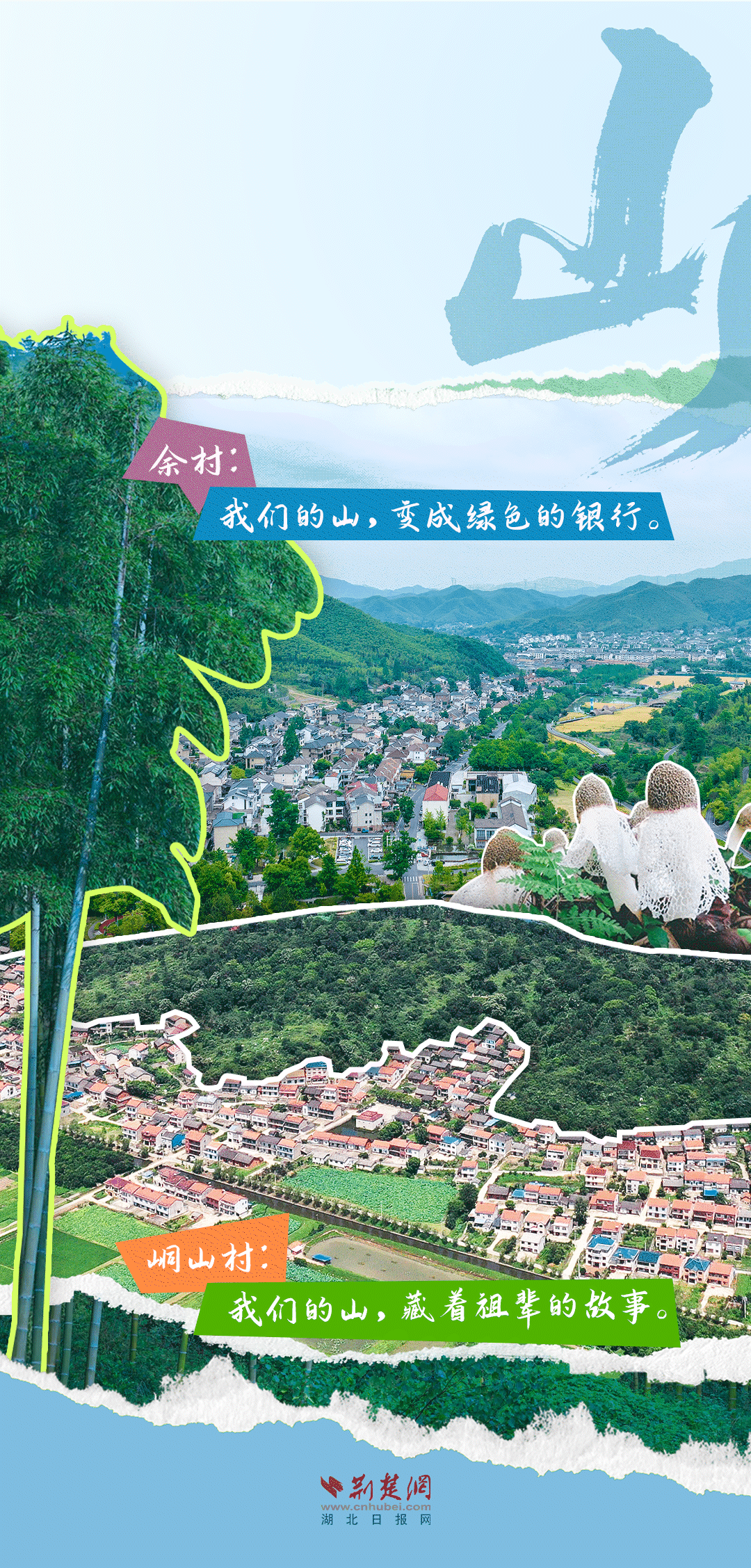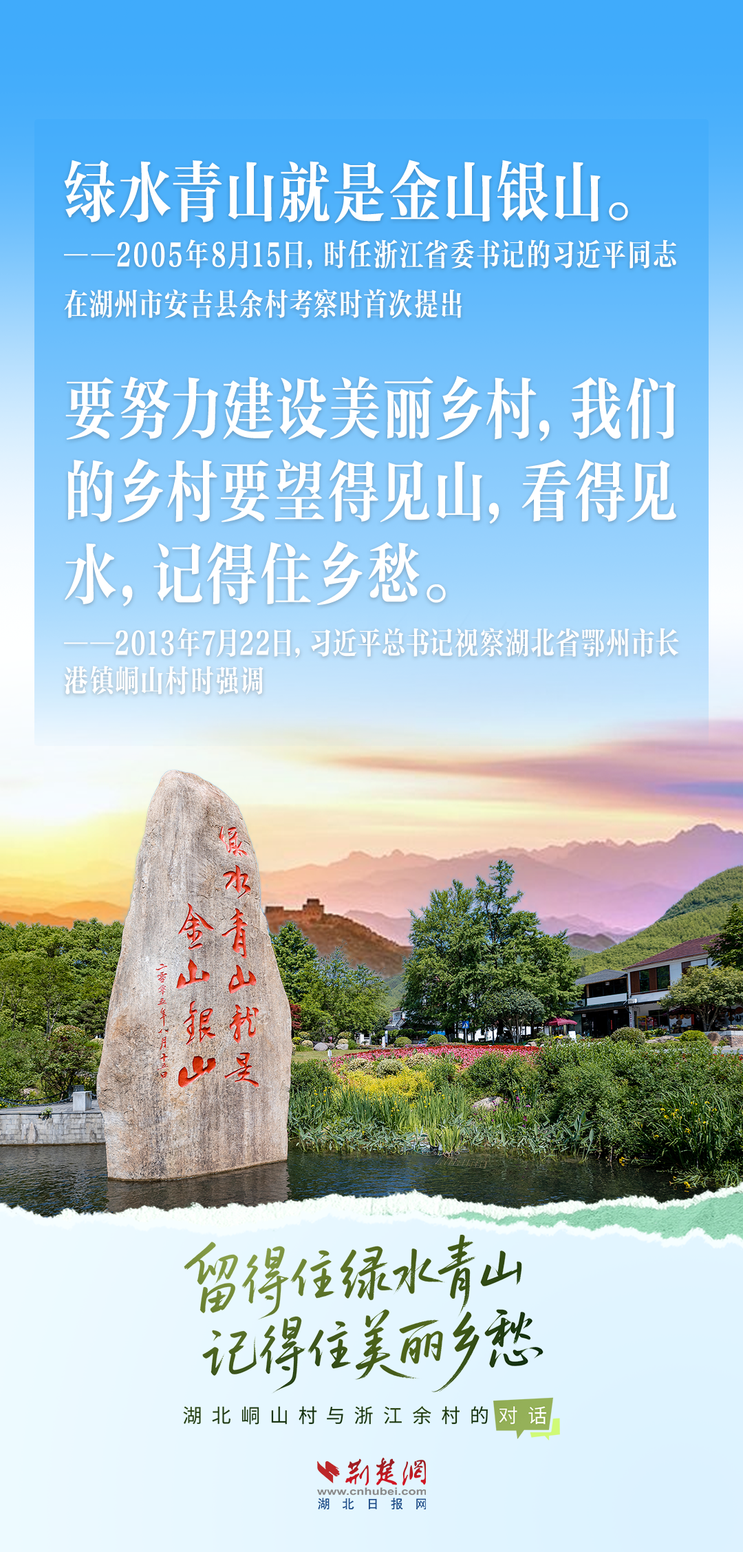 今天,荊楚網(湖北日報網)推出創意海報《留得住綠水青山,記得住美麗鄉愁——湖北峒山村與浙江余村的對話》,展示中國鄉村的美麗畫卷。