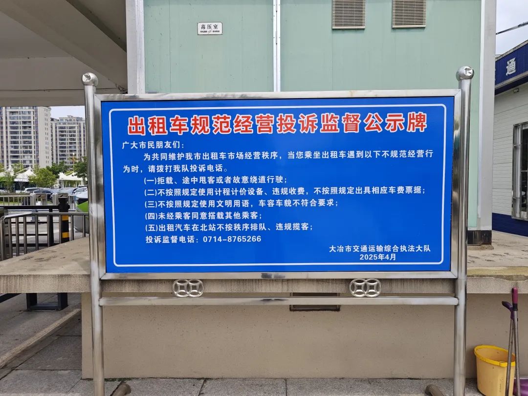 值得注意的是,今年7月,市交通運輸綜合執法大隊在大冶北站出站口設置了出租車投訴點,旁有“出租車規范經營投訴監督公示牌”,明確拒載、不按規定使用計價設備等行為可在此投訴。