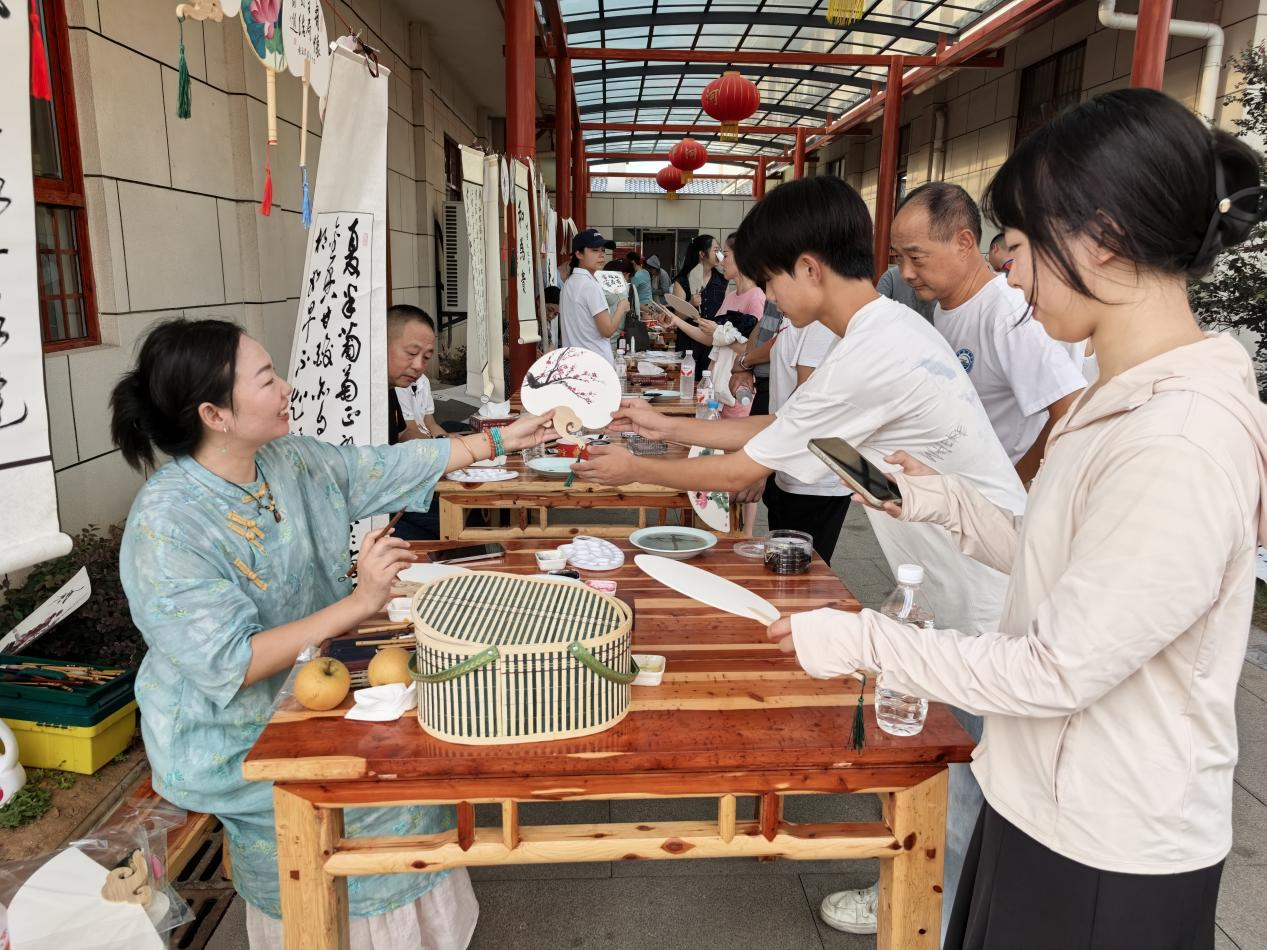 采摘季的熱鬧,不止在葡萄架下。園區(qū)內(nèi)的文化活動(dòng)區(qū),扇子繪畫(huà)與書(shū)法桌前圍滿了人。老師們凝神揮毫,有的在扇面勾勒黛色遠(yuǎn)山、粉紅梅花,有的書(shū)寫(xiě)“喜樂(lè)安康”“清風(fēng)徐來(lái)”,圍觀群眾有序排隊(duì),盼著領(lǐng)走專屬自己的“文化伴手禮”。