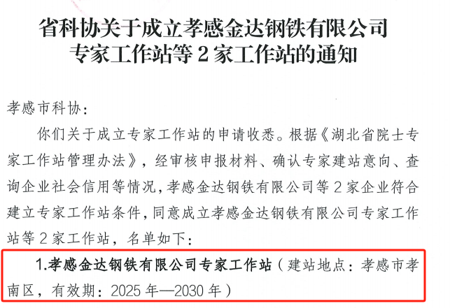 荊楚網(wǎng)(湖北日報網(wǎng))訊(通訊員 陳娟)近日,湖北省科協(xié)公布了《省科協(xié)關(guān)于成立孝感金達(dá)鋼鐵有限公司專家工作站等2家工作站的通知》,孝感金達(dá)鋼鐵有限公司專家工作站正式獲批成立,為孝南區(qū)首家與外籍院士共建的專家工作站。