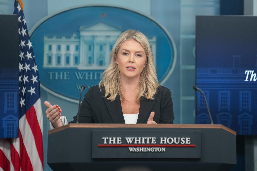 7月7日,在美國首都華盛頓白宮,白宮新聞發(fā)言人卡羅琳·萊維特出席記者會。新華社記者胡友松攝