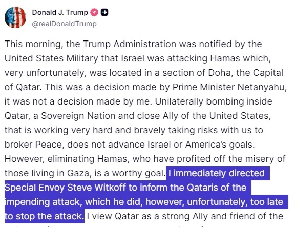 9日,美國總統(tǒng)特朗普在其社交平臺“真實社交”發(fā)文稱,當(dāng)天上午,政府接到美軍通知,以色列正在對位于多哈某區(qū)域的哈馬斯目標(biāo)實施襲擊。特朗普稱,襲擊是以總理內(nèi)塔尼亞胡單方面的決定,而不是他的決定。特朗普稱,他當(dāng)時“立即指示特使威特科夫向卡塔爾通報即將發(fā)生的襲擊”。襲擊發(fā)生后,他與卡塔爾埃米爾(國家元首)及首相通話,保證此類事件不會在其領(lǐng)土重演。他還已指示國務(wù)卿魯比奧盡快完成與卡塔爾的防務(wù)合作協(xié)議。
