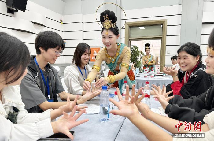 9月9日,日本秋田縣大學生代表團與西北師范大學學生進行交流互動,學習敦煌舞手勢動作。中新社記者 丁思 攝