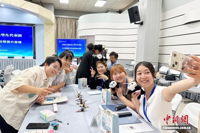9月9日,日本秋田縣大學生代表團與西北師范大學學生進行交流互動,秋田大學學生兼田姬梨(右一)與新朋友們合影留念。中新社記者 丁思 攝