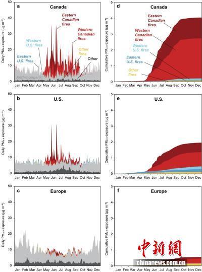 不同來源野火對2023年加拿大、美國和歐洲地區(qū)人群逐日PM2.5污染暴露水平貢獻的示意圖。張強 供圖