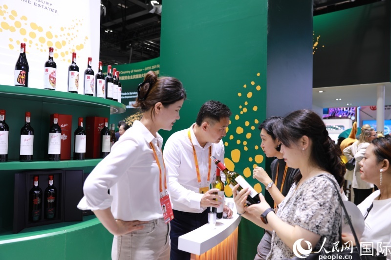 觀眾在澳大利亞國(guó)家館咨詢紅酒業(yè)務(wù)。人民網(wǎng)記者 賈文婷攝