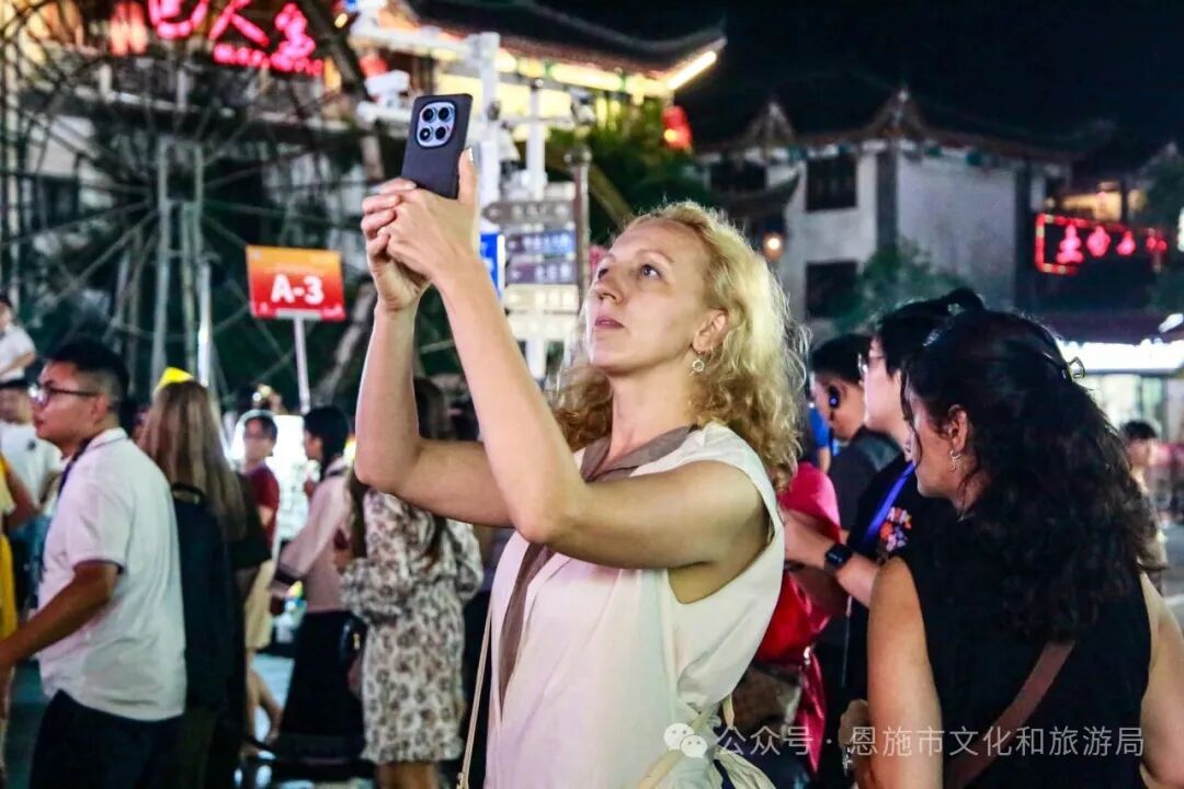 來到恩施市的首站,旅行商團(tuán)隊(duì)走進(jìn)恩施女兒城。通過古色古香的吊腳樓群、原汁原味的民俗表演和互動(dòng)體驗(yàn),讓外賓們直呼“穿越時(shí)空”。圍著篝火跳完擺手舞,來自俄羅斯的代表興奮地表示:“傳統(tǒng)舞蹈的韻律和熱情極具感染力,這種活態(tài)文化傳承比博物館展示更令人難忘!”