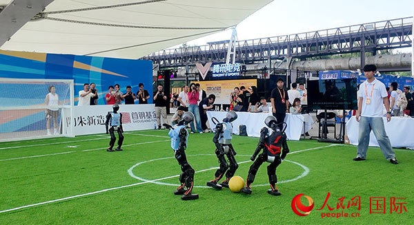 在服貿(mào)會(huì)體育服務(wù)展區(qū),機(jī)器人踢足球吸引觀眾駐足。人民網(wǎng)記者 吳凱攝