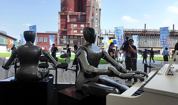 在服貿(mào)會(huì)體育服務(wù)展區(qū),機(jī)器人在彈鋼琴。人民網(wǎng)記者 吳凱攝