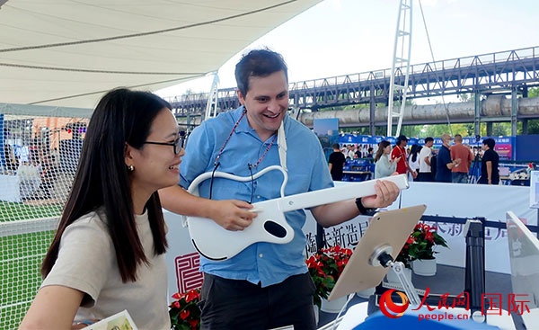 在服貿(mào)會(huì)體育服務(wù)展區(qū),觀眾體驗(yàn)“陶朱新造局”帶來(lái)新材料制作的吉他。人民網(wǎng)記者 吳凱攝