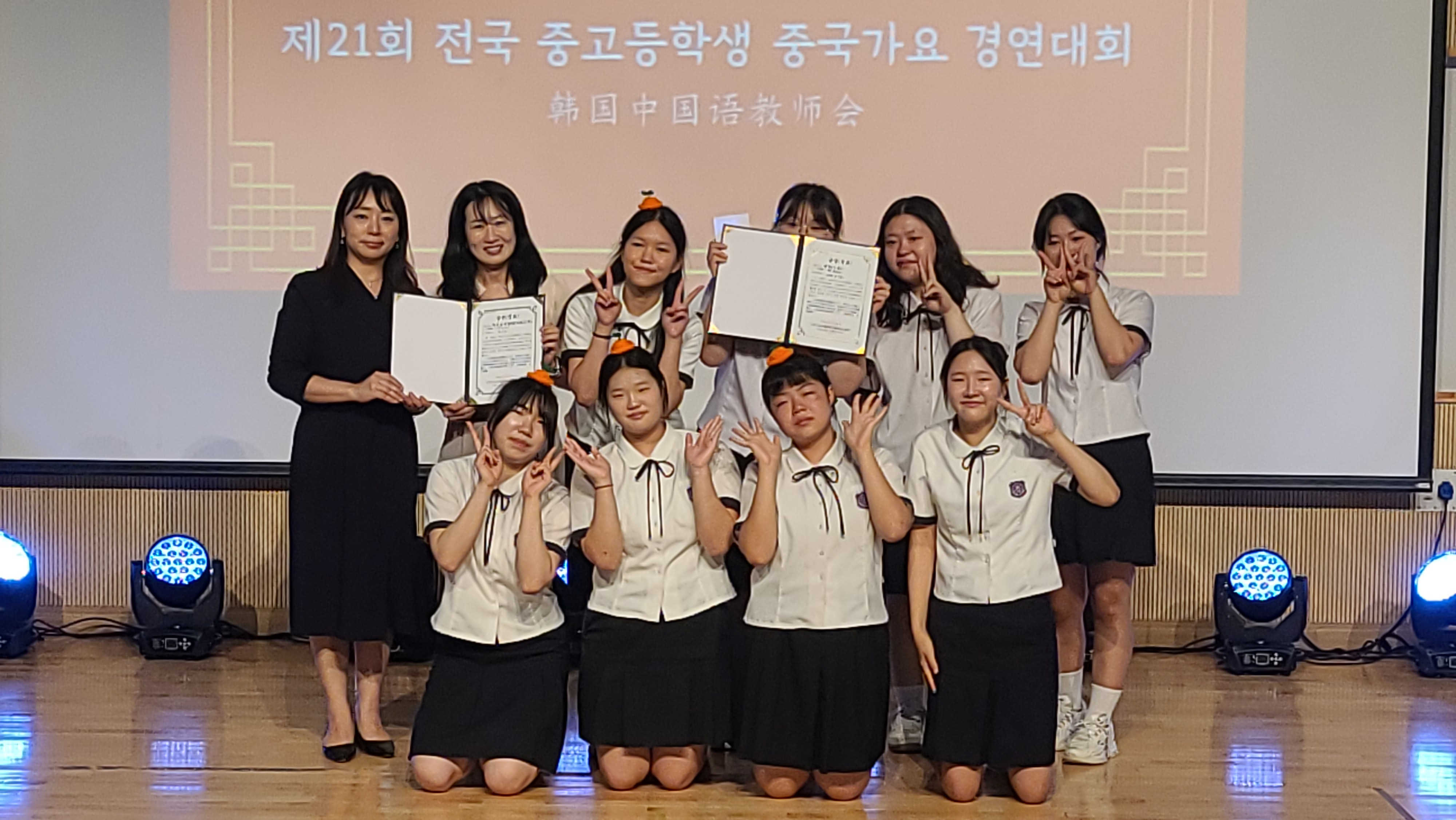 | 13日,“第21屆全國中學生中文歌曲大賽”在韓國舉行。圖為獲獎選手與頒獎嘉賓合影。韓國中國語教師會供圖 |