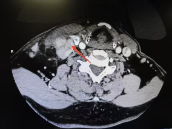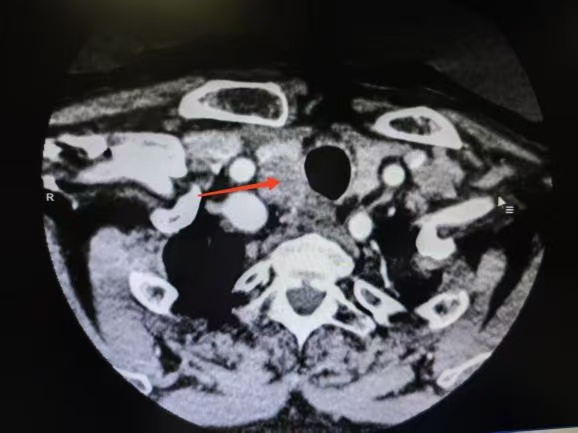 CT箭頭所示:側(cè)頸區(qū)轉(zhuǎn)移淋巴結(jié)