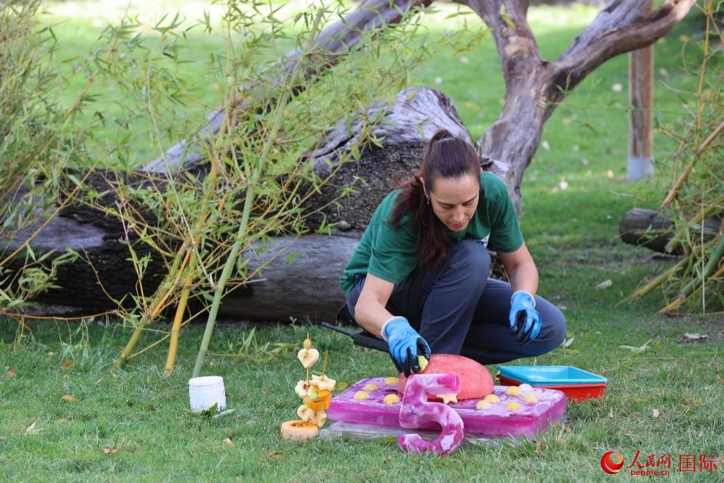 圖為飼養(yǎng)員為大熊貓準(zhǔn)備特制的生日蛋糕。人民網(wǎng)記者 許海林?jǐn)z