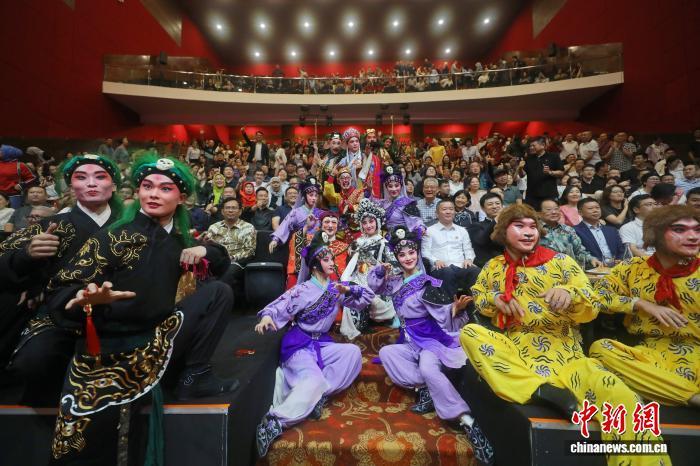 9月23日晚,浙江婺劇團(tuán)雅加達(dá)專場(chǎng)上演。圖為謝幕后,眾演員與觀眾合影。中新社記者 李志全 攝