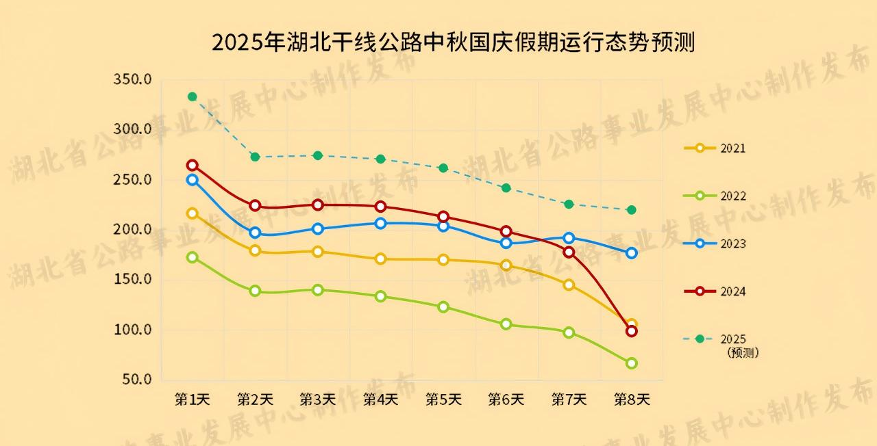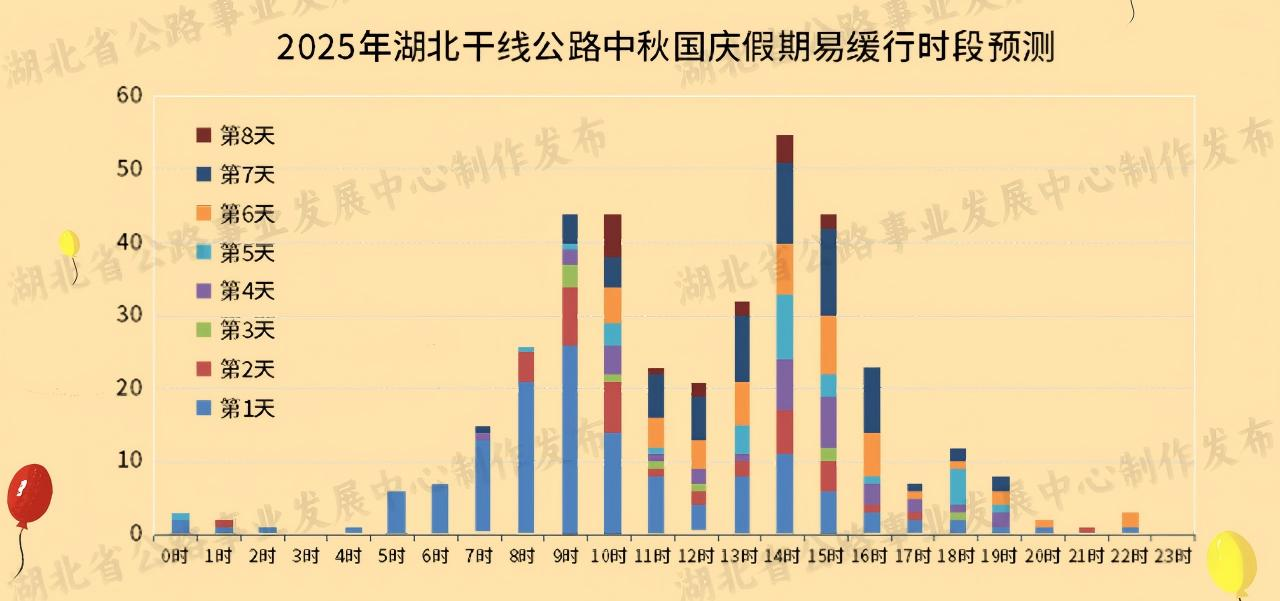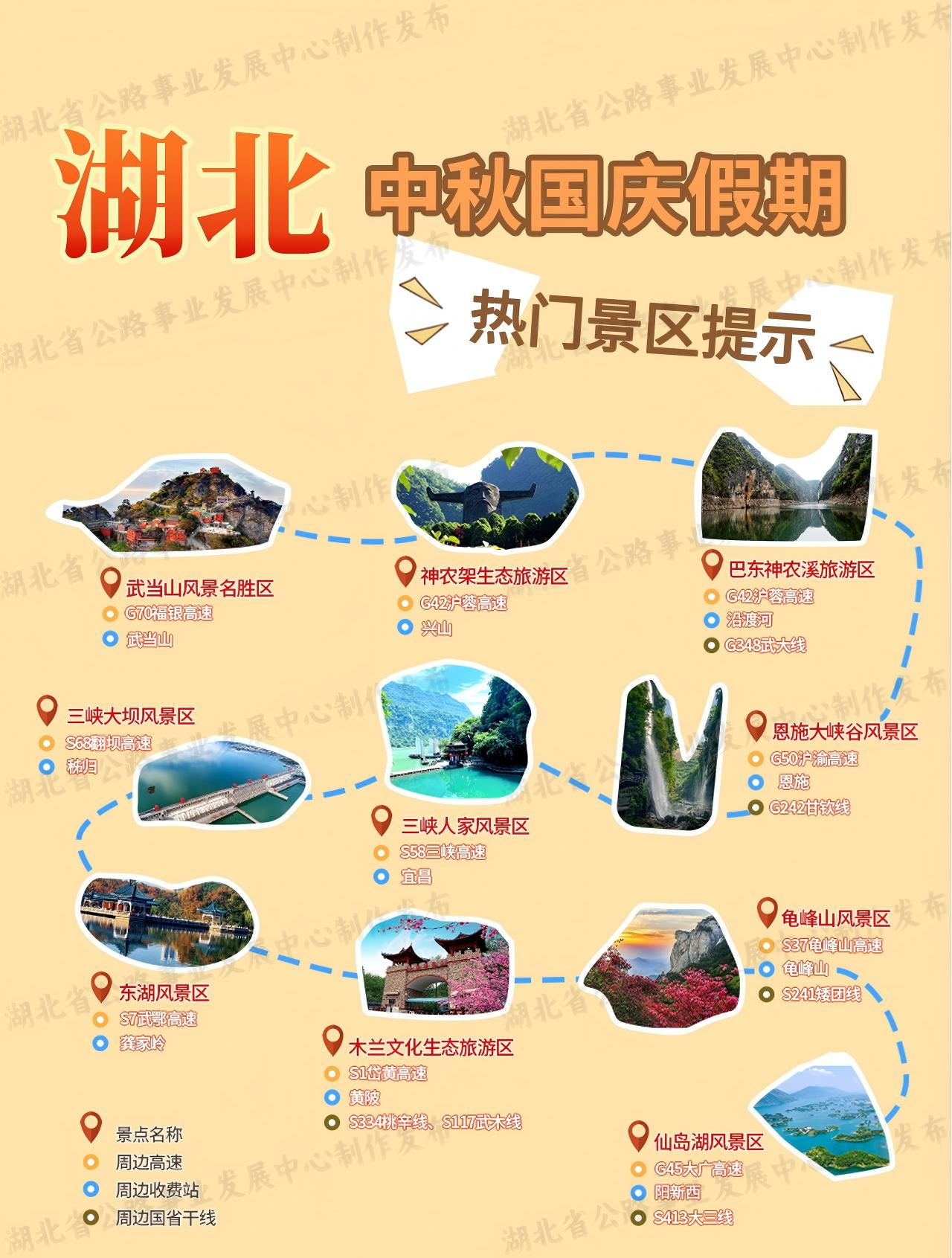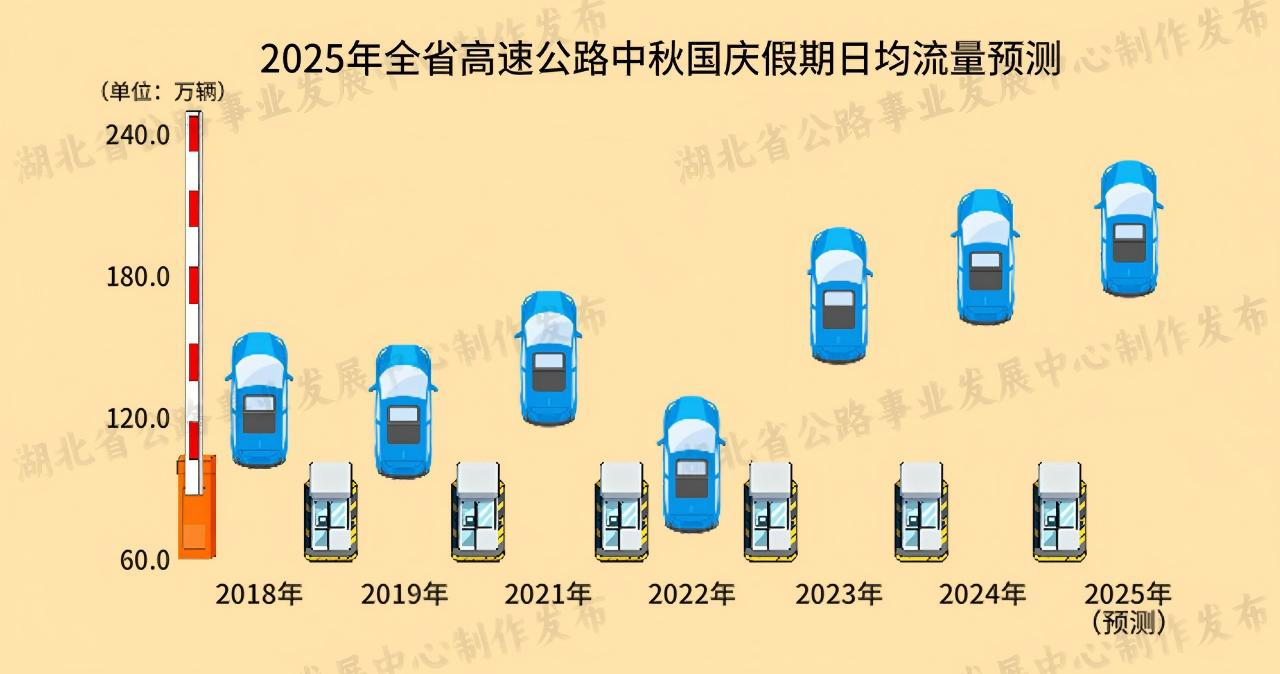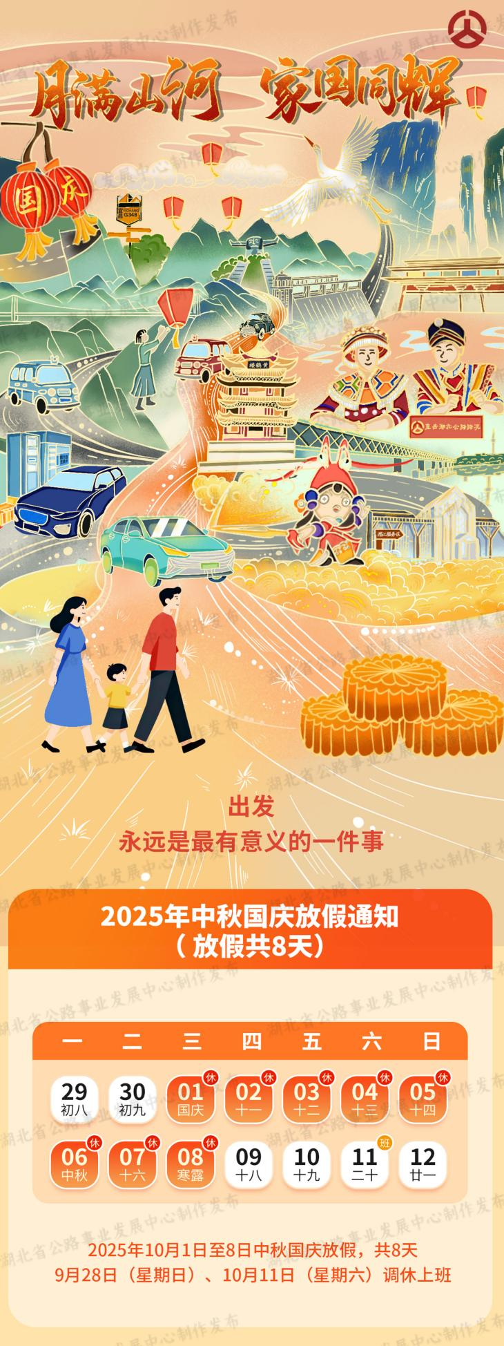 2025年中秋國(guó)慶假期即將到來,放假時(shí)間為10月1日至10月8日。根據(jù)國(guó)務(wù)院發(fā)布的《關(guān)于批轉(zhuǎn)交通運(yùn)輸部等部門重大節(jié)假日免收小型客車通行費(fèi)實(shí)施方案的通知》,中秋國(guó)慶假期期間,收費(fèi)公路對(duì)7座及以下小型客車免費(fèi)通行,免費(fèi)時(shí)間段為10月1日0時(shí)至10月8日24時(shí),共計(jì)八天。湖北省公路事業(yè)發(fā)展中心根據(jù)歷年來中秋國(guó)慶假期全省公路網(wǎng)運(yùn)行監(jiān)測(cè)情況分析,預(yù)計(jì)今年中秋國(guó)慶期間路網(wǎng)流量較平日大幅增長(zhǎng),社會(huì)公眾探親訪友、度假旅游等中短途出行需求將會(huì)集中釋放,省內(nèi)各市州周邊路段和通往省內(nèi)知名景區(qū)路段的交通流量將出現(xiàn)明顯增幅,省內(nèi)國(guó)高網(wǎng)、國(guó)省干線、武漢市周邊路段易出現(xiàn)不同程度的擁堵緩行?,F(xiàn)編制《2025年中秋國(guó)慶假期湖北省干線公路出行指南》,為公眾平安便捷出行提供參考。