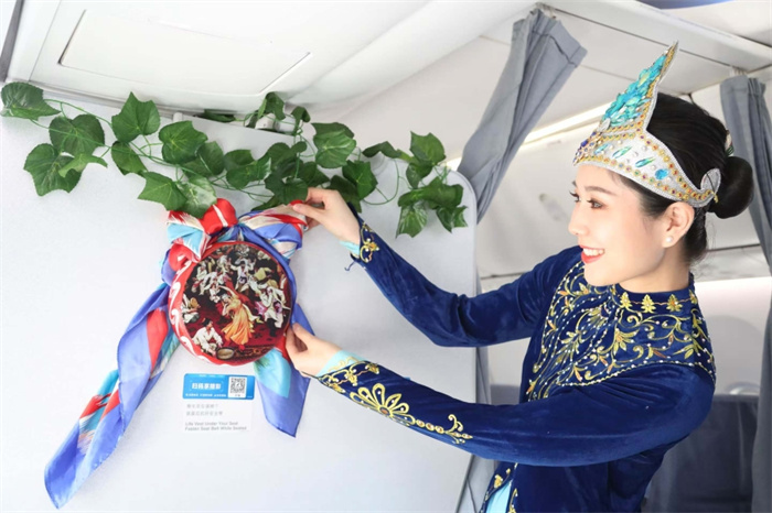 空乘人員擺放紀念復航陳設。南方航空供圖