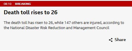 中新網(wǎng)10月1日電 據(jù)英國(guó)廣播公司(BBC)等外媒報(bào)道,菲律賓國(guó)家減災(zāi)管理委員會(huì)稱,截至當(dāng)?shù)貢r(shí)間10月1日8時(shí),9月30日發(fā)生在該國(guó)宿務(wù)省的6.9級(jí)地震已造成26人死亡、147人受傷,2個(gè)市鎮(zhèn)已經(jīng)宣布進(jìn)入災(zāi)難狀態(tài)。