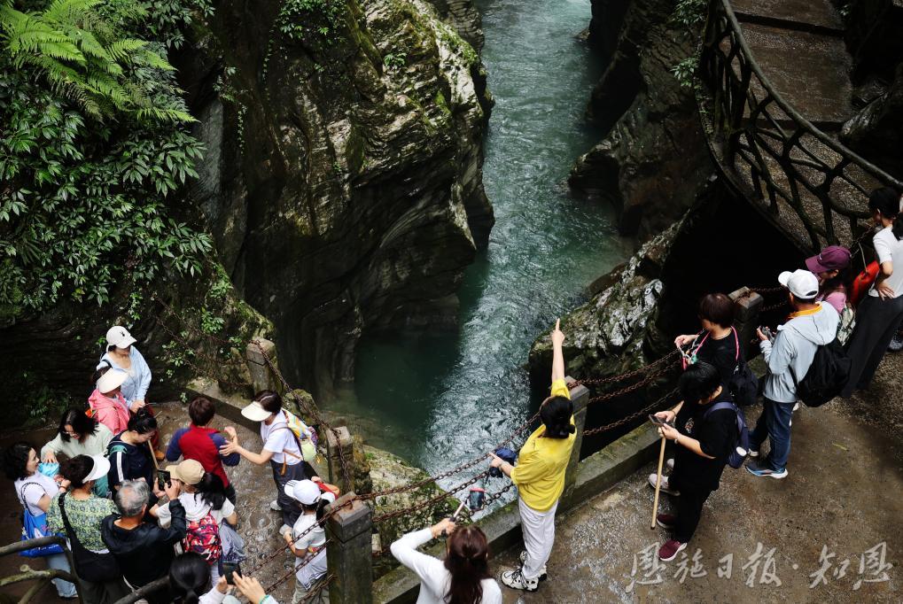 峽谷間,溪流潺潺,奇峰競(jìng)秀,游客們或駐足凝望,或舉機(jī)留影,將大自然的鬼斧神工珍藏于鏡頭之中。孩子們?cè)谟H水步道上歡笑嬉戲,大人們?cè)谟^景平臺(tái)上悠然小憩,處處洋溢著節(jié)日的歡愉。