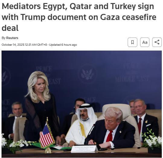 中新網(wǎng)10月14日電 據(jù)路透社報道,當?shù)貢r間13日,美國總統(tǒng)特朗普在埃及沙姆沙伊赫,與埃及、卡塔爾和土耳其三國領(lǐng)導人共同簽署了關(guān)于加沙?;饏f(xié)議的文件。