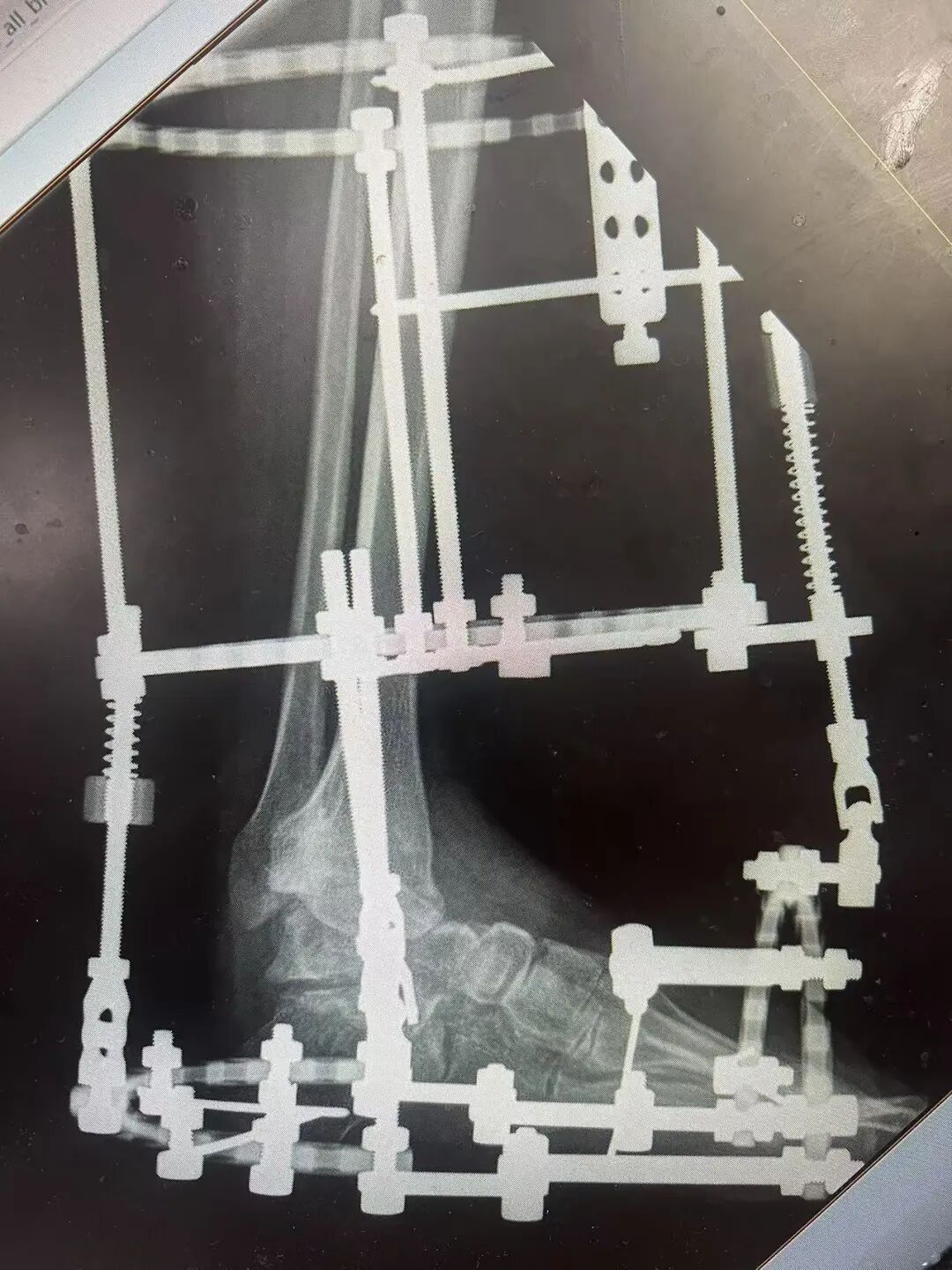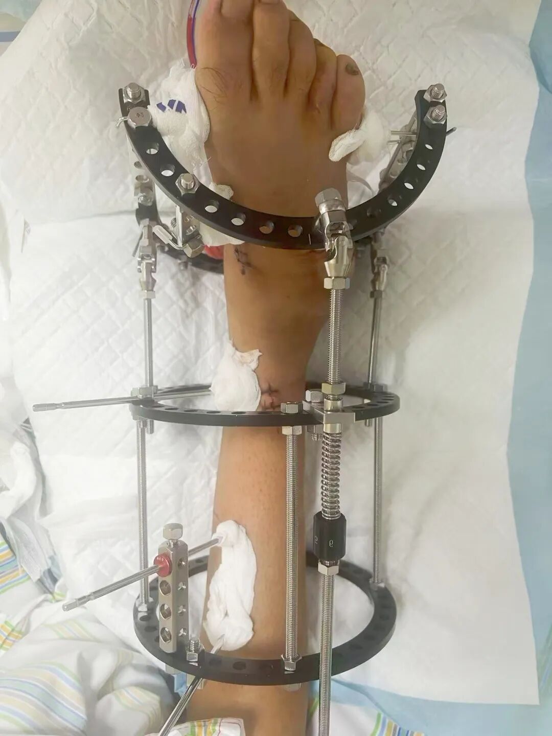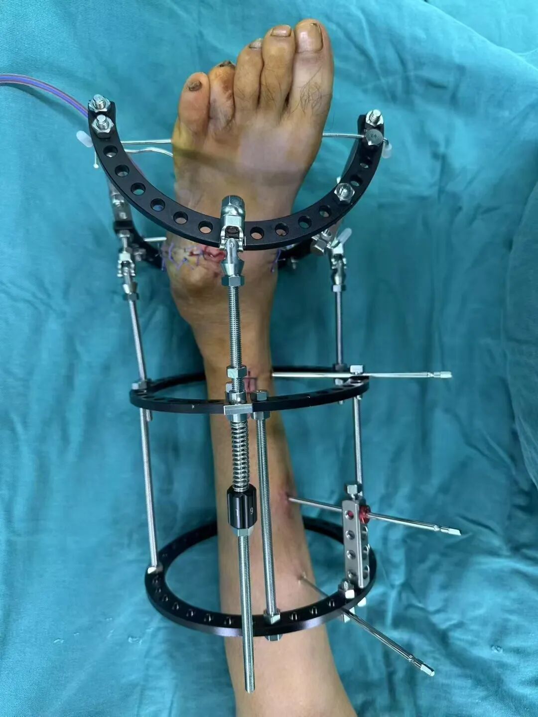 針對陽先生的復(fù)雜情況,鄭群龍醫(yī)師團隊制定了詳盡的手術(shù)方案:左踝關(guān)節(jié)融合+馬蹄足畸形矯正+跟腱延長+外固定架固定術(shù)。手術(shù)的核心,正是伊里扎洛夫技術(shù)。這項技術(shù)如同精密的“時空建筑學(xué)”,通過微創(chuàng)安裝環(huán)形外固定架,前足-后足安裝鋼環(huán),再將足的鋼環(huán)與脛骨的固定鋼環(huán)在踝關(guān)節(jié)前、后、左、右用帶關(guān)節(jié)的螺紋桿連接,由此構(gòu)建成一個能體外牽拉調(diào)控的三維立體構(gòu)型,在術(shù)后進行精準、緩慢的調(diào)整,一寸一寸逐步將畸形的骨骼、軟組織恢復(fù)到正常位置。