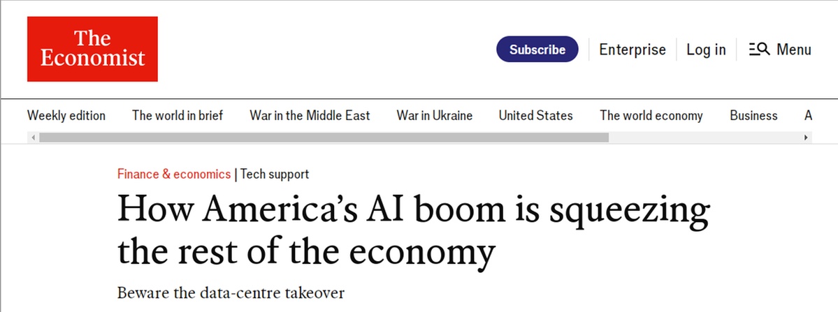 英國《經(jīng)濟學(xué)人》雜志近期評論指出,除了人工智能之外,美國經(jīng)濟的大部分領(lǐng)域似乎都顯得低迷。AI爆發(fā)式增長雖能“美化”數(shù)字,卻忽略了美國實體經(jīng)濟的空心化,導(dǎo)致GDP含金量低。