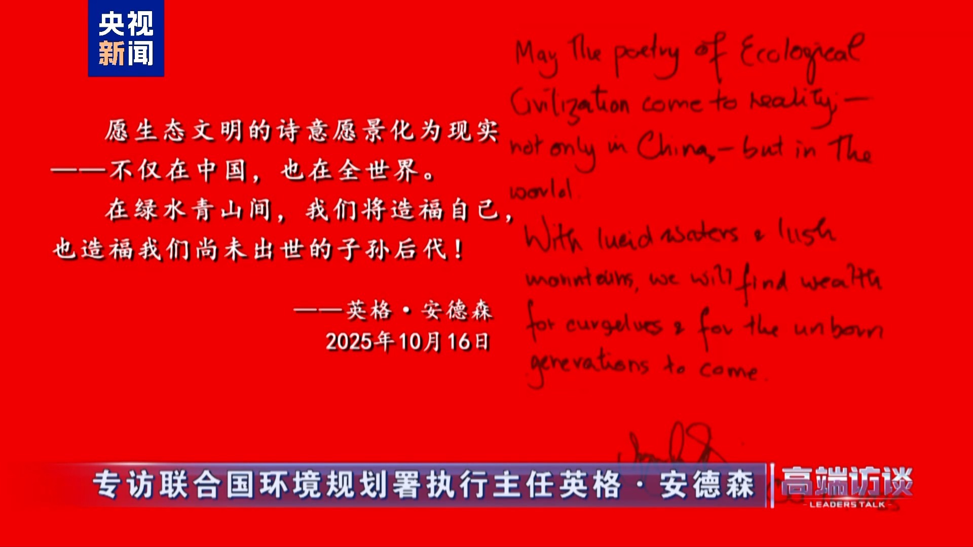 聯(lián)合國環(huán)境規(guī)劃署執(zhí)行主任英格·安德森在接受總臺(tái)專訪后題詞:
