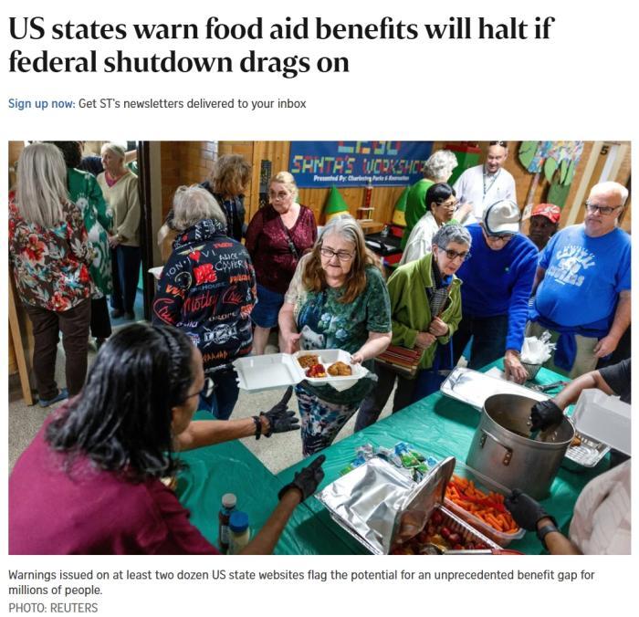 據(jù)美國廣播公司(ABC)報道稱,美國農(nóng)業(yè)部在一份通知中表示: “歸根結底,資金已經(jīng)枯竭。11月1日起將不會發(fā)放任何福利。”