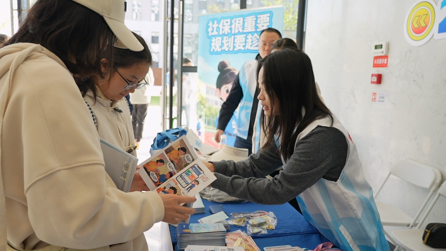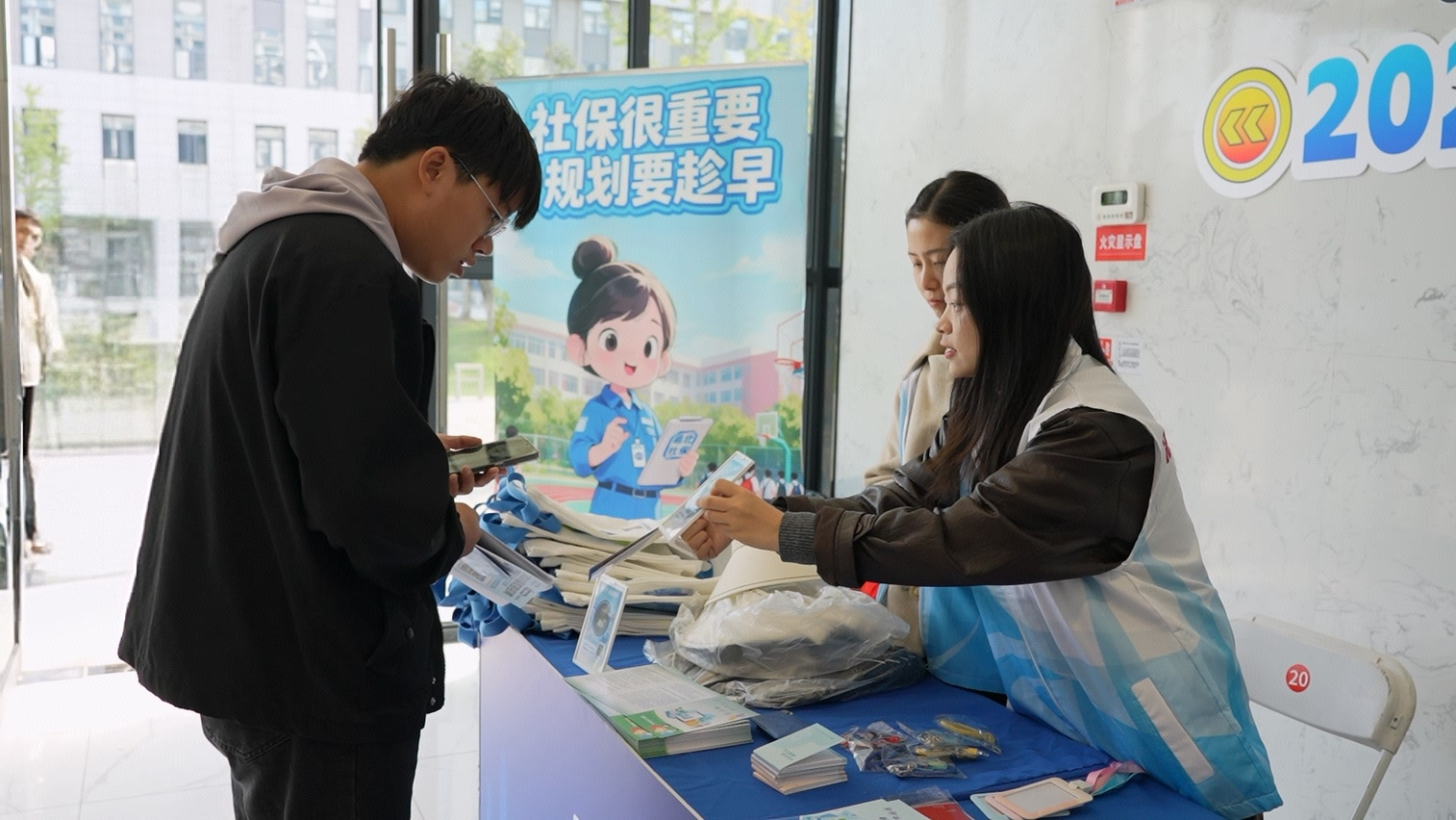 在湖北工業(yè)大學(xué)中區(qū)雙創(chuàng)大樓,工作人員向同學(xué)們發(fā)放了專(zhuān)門(mén)為大學(xué)生群體量身打造的社保政策科普漫畫(huà)《小藍(lán)寶社保奇遇記》,并圍繞大家普遍關(guān)心的參保政策、繳費(fèi)標(biāo)準(zhǔn)、社保關(guān)系轉(zhuǎn)移等內(nèi)容面對(duì)面答疑,現(xiàn)場(chǎng)氣氛熱烈而活躍。