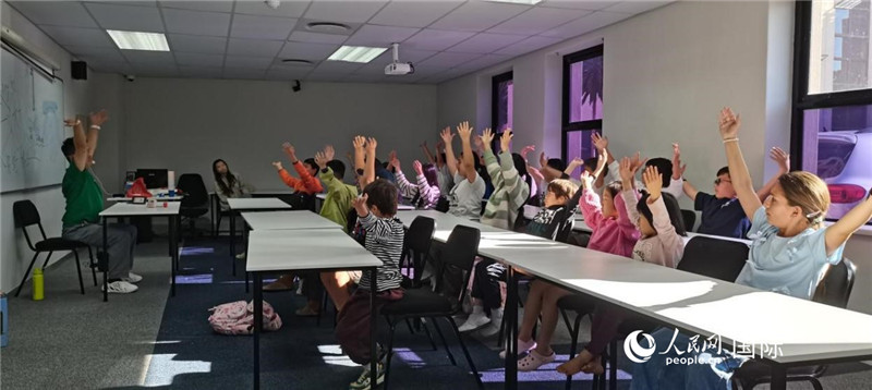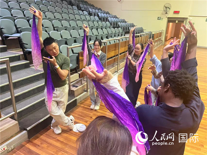 林晟昱老師在西開普大學(xué)中醫(yī)孔子學(xué)院向當(dāng)?shù)貛熒鷤魇谘砀琛霸E竅”。人民網(wǎng)記者 鄒松攝
