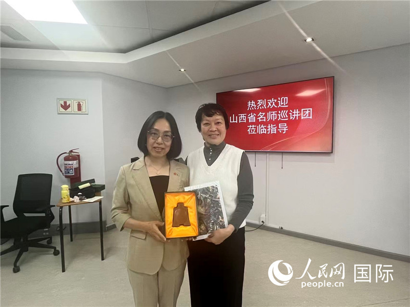 山西省名師巡講團(tuán)與西開普大學(xué)中醫(yī)孔子學(xué)院互贈(zèng)紀(jì)念品。人民網(wǎng) 董嘉怡攝