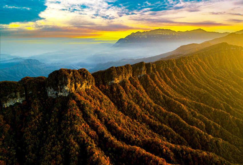 光明璀璨,霧象萬千。光霧山,地處中國(guó)南北氣候分界線,獨(dú)特的地理位置和復(fù)雜多變的山地氣候,孕育了極其豐富的植物群落。每當(dāng)深秋時(shí)節(jié),寒意浸染,以巴山水青岡、槭樹、黃櫨等為主的680平方公里彩林,便奏起了生命的華彩樂章。色彩從山頂向山谷層層浸染,緋紅、橙紅、霞紅、金紅、絳紫……各種紅色交織疊加,如巨幅油畫,似流霞滿天,其面積之廣闊、色彩之斑斕、層次之分明、觀賞期之綿長(zhǎng),構(gòu)成了“亞洲最長(zhǎng)紅地毯”的驚世之美,堪稱自然造物的奇跡。