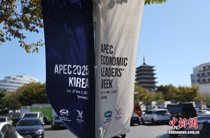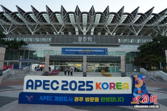 當(dāng)?shù)貢r(shí)間10月27日,韓國慶州火車站前的亞太經(jīng)合組織(APEC)標(biāo)識(shí)。中新社記者 劉旭 攝