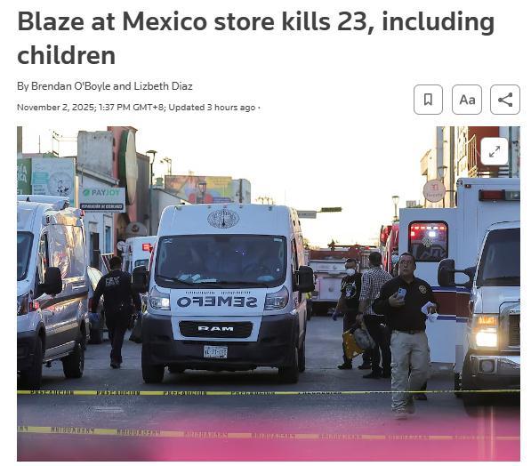 中新網(wǎng)11月2日電 據(jù)路透社報道,當(dāng)?shù)貢r間11月1日,墨西哥北部索諾拉州首府埃莫西約市一商店發(fā)生火災(zāi),目前已致至少23人死亡,10余人受傷。