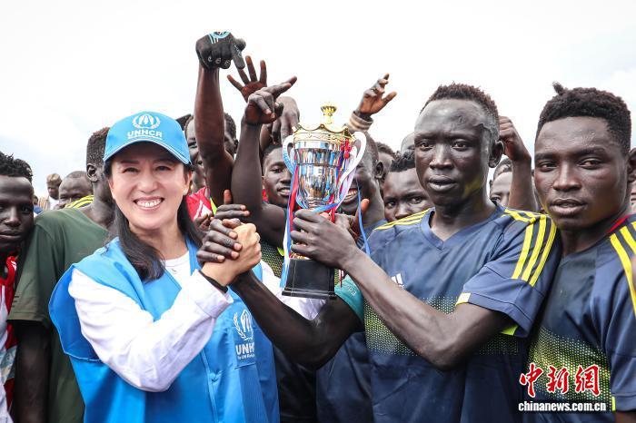 當(dāng)?shù)貢r(shí)間2025年9月23日,聯(lián)合國難民署親善大使楊揚(yáng)訪問位于埃塞俄比亞的班巴西難民營,與難民及當(dāng)?shù)厣鐓^(qū)足球友誼賽獲勝團(tuán)隊(duì)共同舉起獎杯。(聯(lián)合國難民署供圖)
