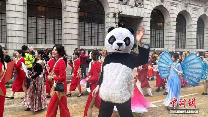 隊伍最前列由六位身著旗袍的禮儀女士領銜、她們或手持中國書畫卷軸、或佩戴印有“好美諸暨”“英國浙江會”字樣的綬帶與珍珠飾品。她們身后登場的,是充滿童趣與文化象征意義的第二方陣——兩只憨態(tài)可掬的大熊貓、兩顆孕育珍珠的貝殼,以及三朵亭亭玉立的荷花。