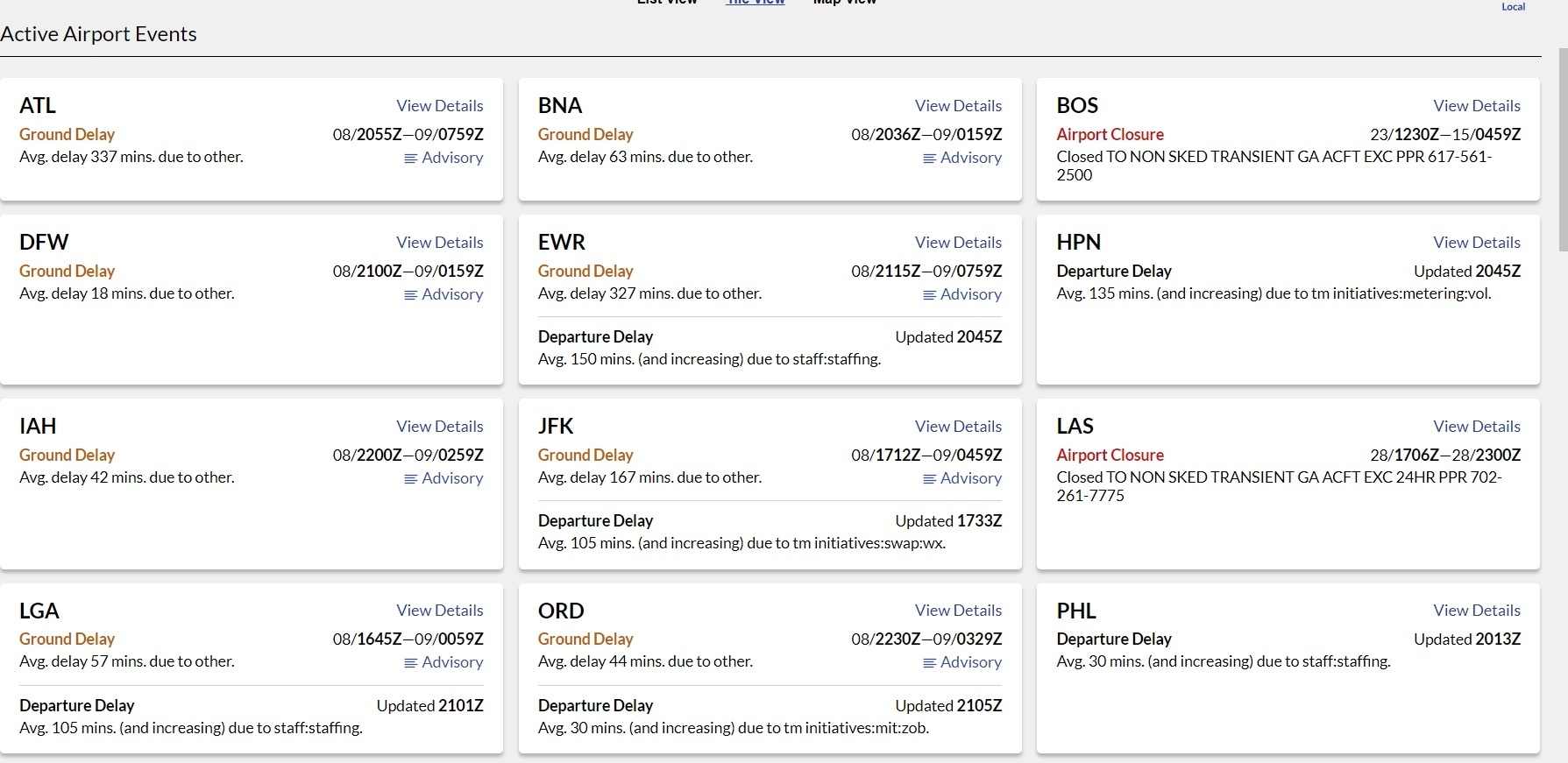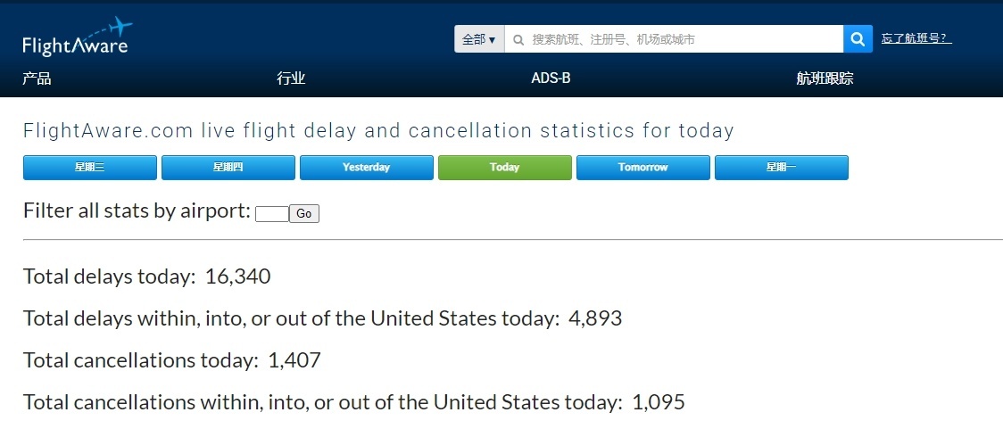 △航班追蹤網(wǎng)站截圖,美國部分出現(xiàn)延誤情況的機(jī)場(chǎng)