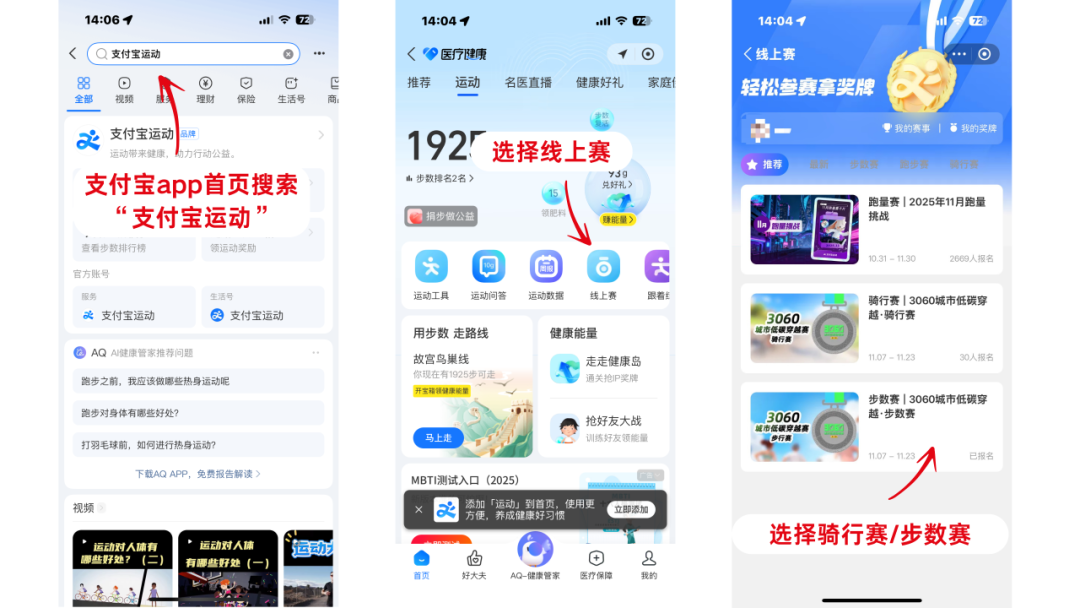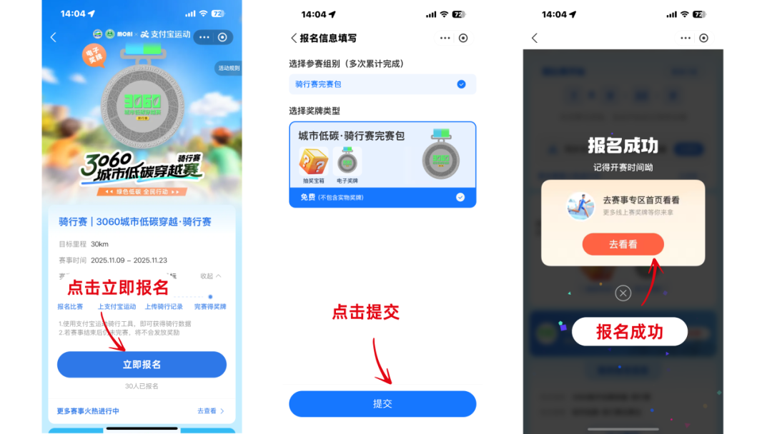 通過(guò)支付寶APP,搜索“支付寶運(yùn)動(dòng)”小程序進(jìn)入“線(xiàn)上賽”專(zhuān)區(qū)報(bào)名參賽,或搜索“3060城市低碳穿越賽”小程序輪播頁(yè)跳轉(zhuǎn)報(bào)名。