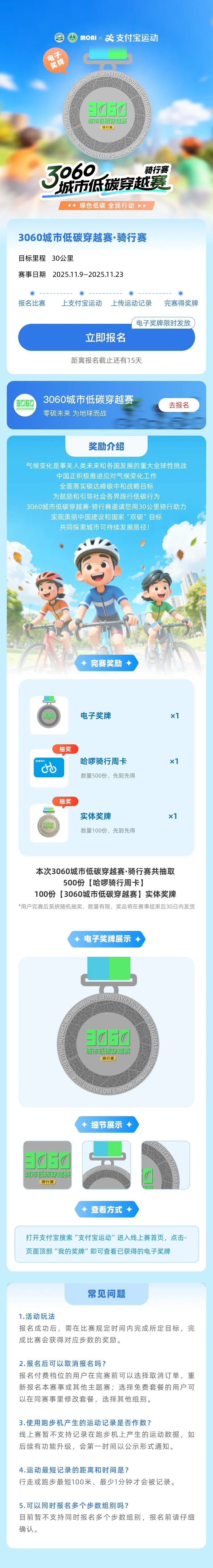騎行賽:公眾報(bào)名參加線(xiàn)上騎行賽,授權(quán)并上傳距離記錄,在活動(dòng)時(shí)間內(nèi)累計(jì)騎行30公里即可完成比賽并獲得獎(jiǎng)勵(lì)。